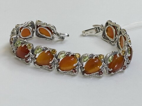 Браслет из эффектных серебряных элементов с натуральным зеленым авантюрином и камнями.