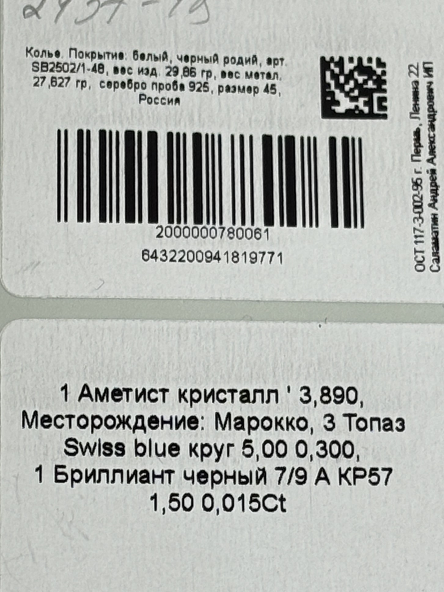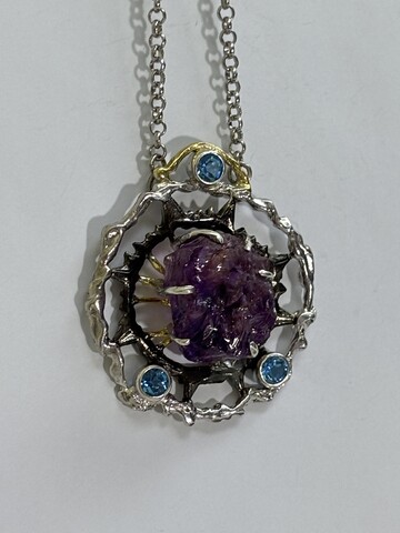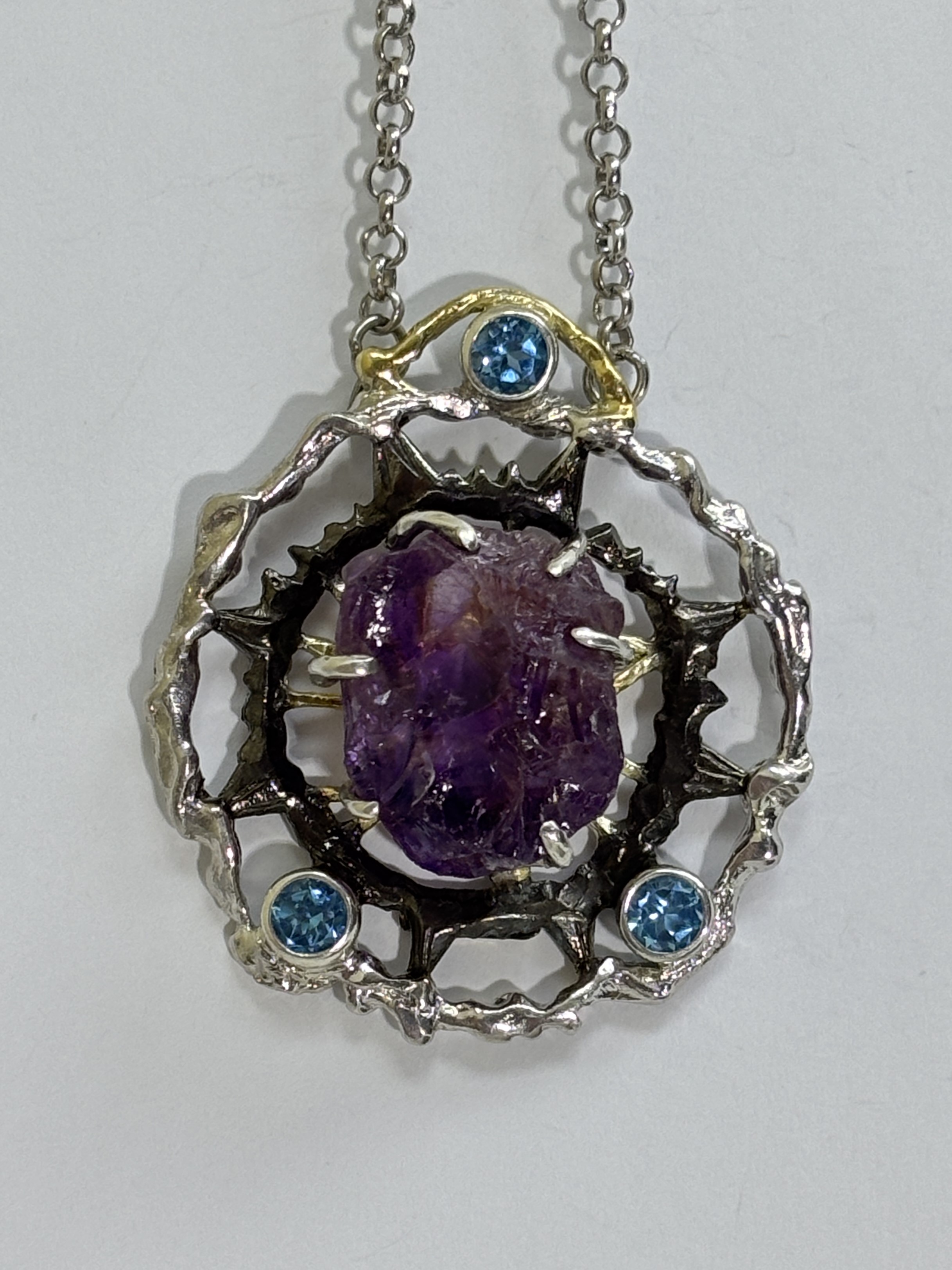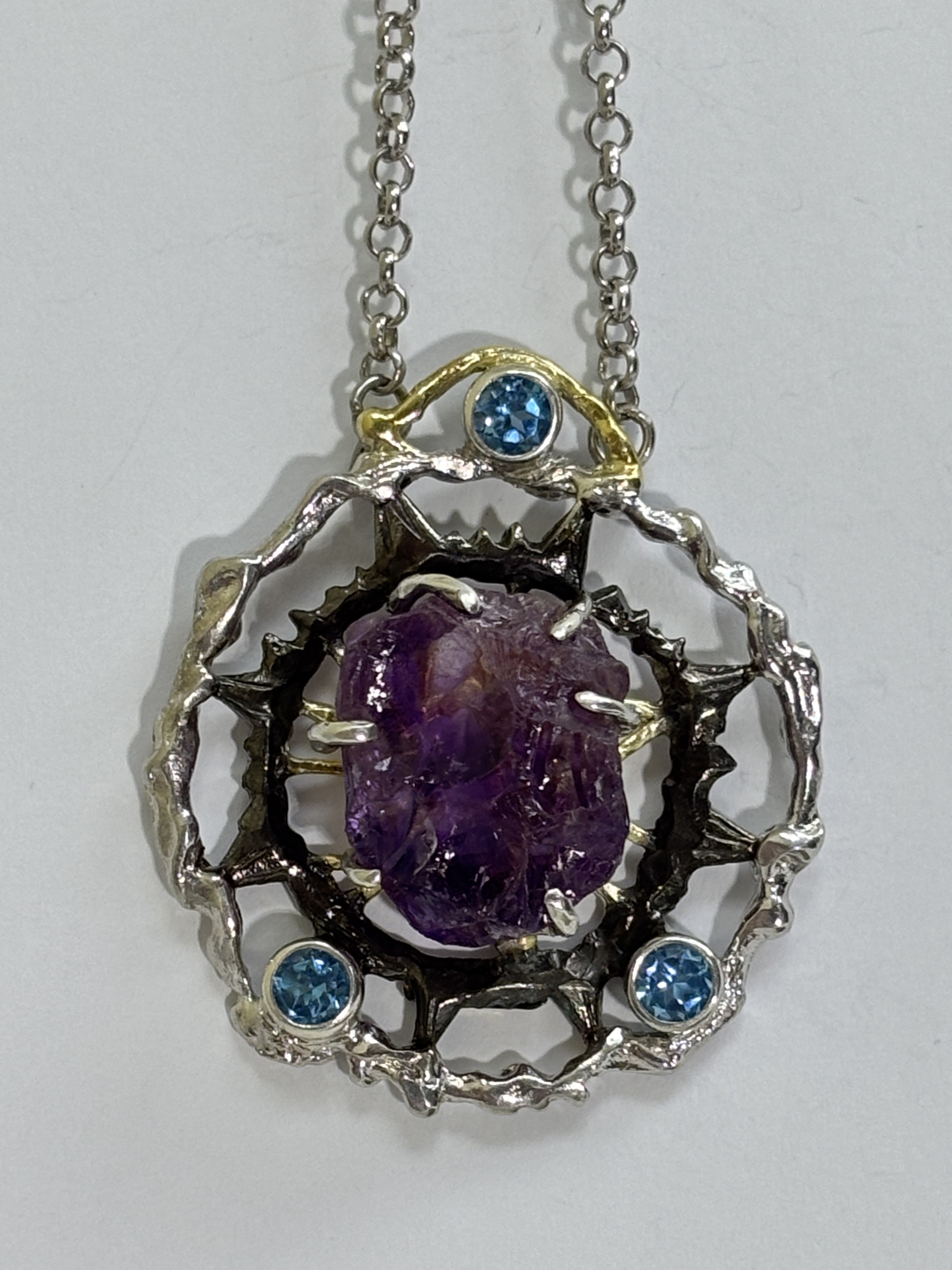 Колье в авторском исполнении с кристаллом аметиста в серебре и позолоте.