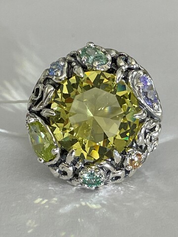 Нежный серебряный цветочный орнамент с фианитами окружил крупный центральный камень . Яркое активное украшение.