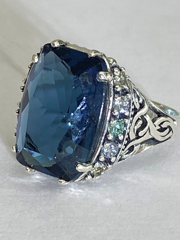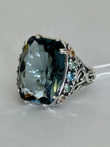 Ограненный камень окружен витиеватым серебряным узором с цветными фианитами.