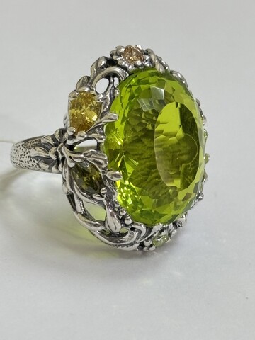Нежный серебряный цветочный орнамент с фианитами окружил крупный центральный камень . Яркое активное украшение.