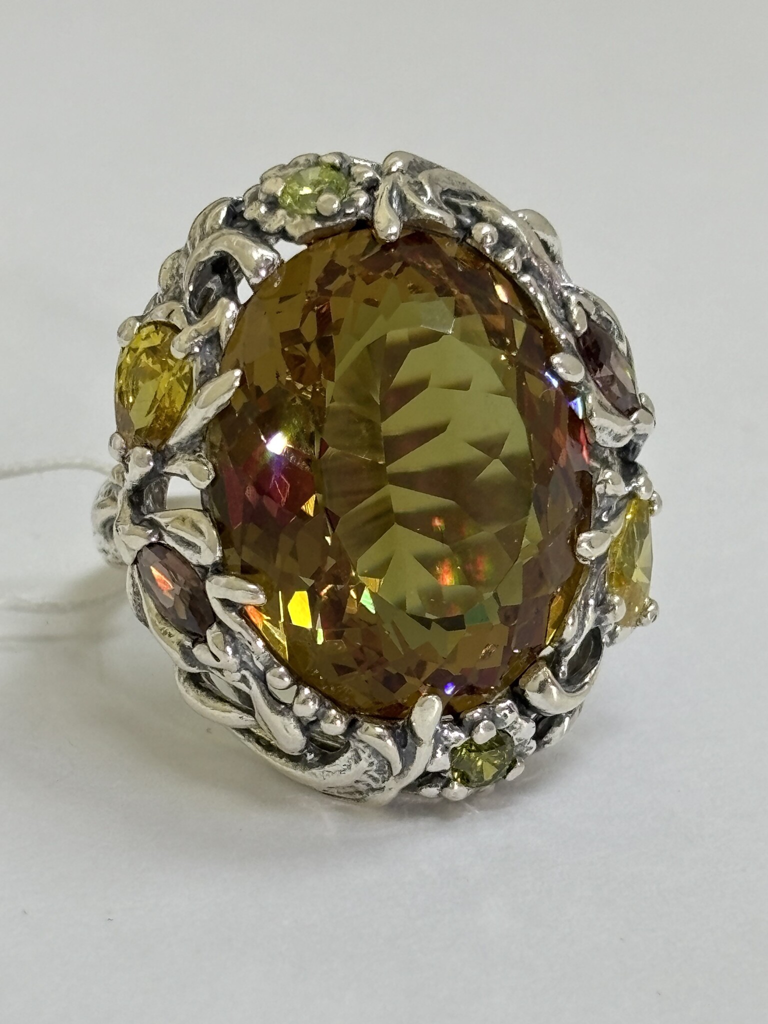 Нежный серебряный цветочный орнамент с фианитами окружил крупный султанит . Яркое активное украшение.