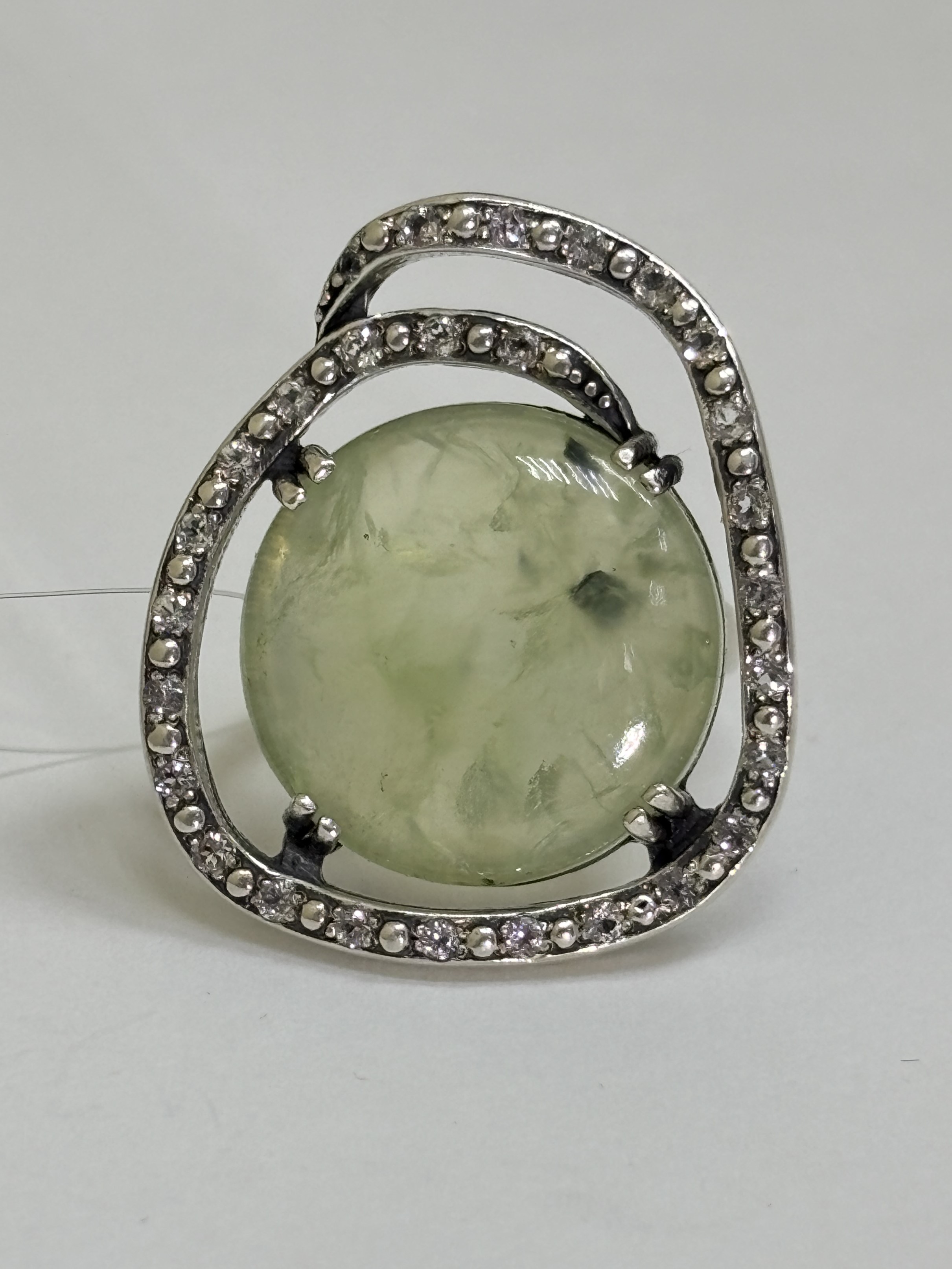 Круглый натуральный кабошон  окружен ломаными завитками из серебра  с цветными фианитами , действительно звезда.