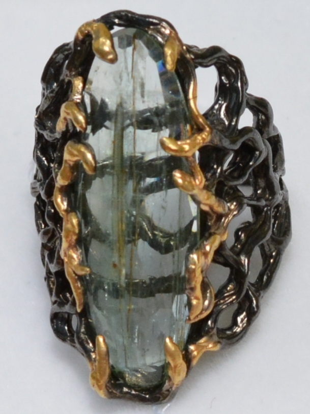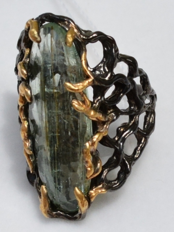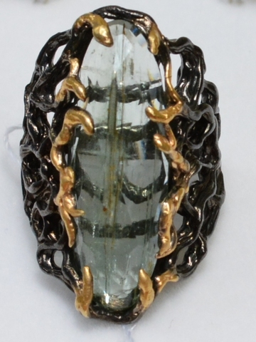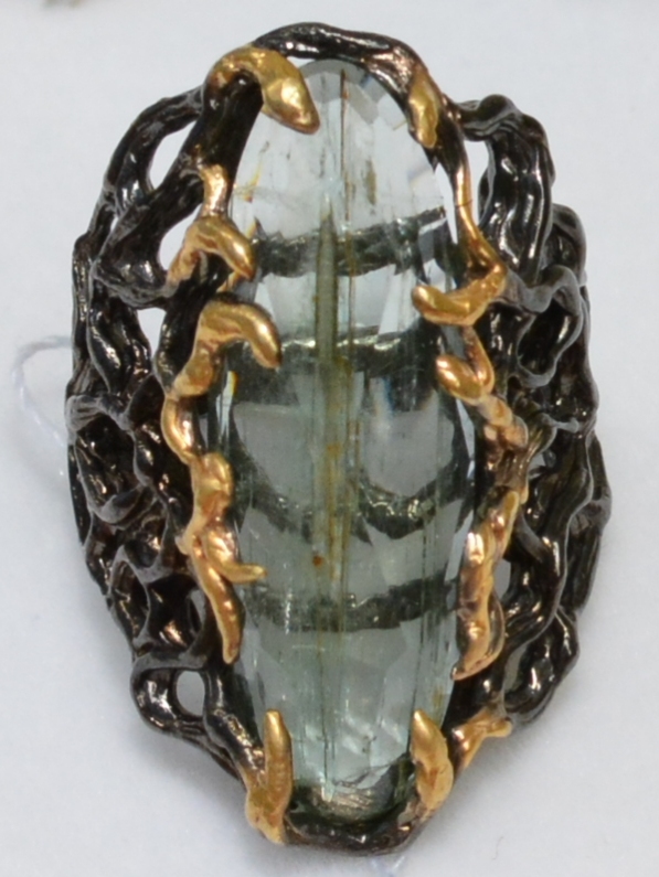 Фантазийное кольцо с натуральным аквамарином и витиеватым серебряным узором с позолотой.