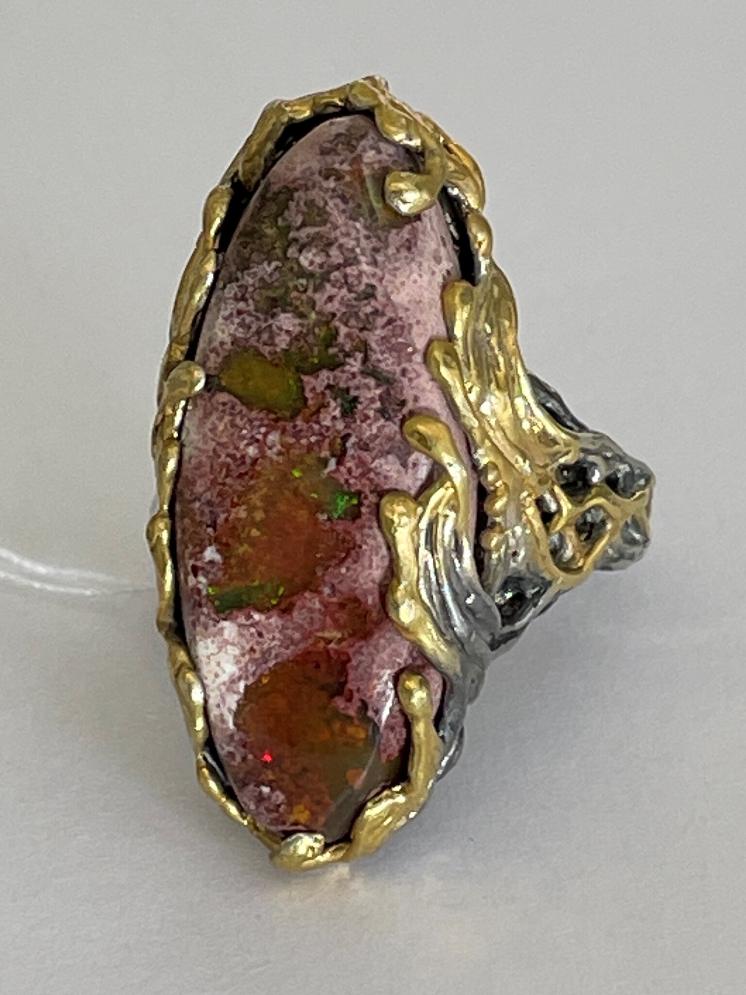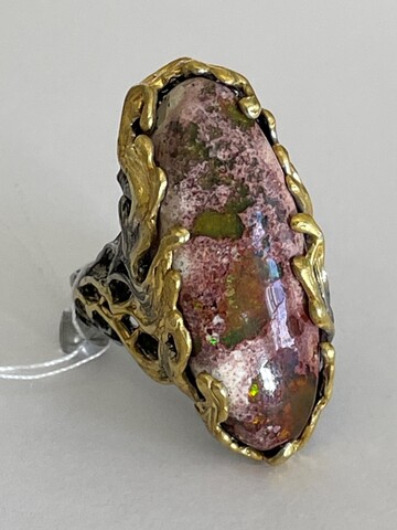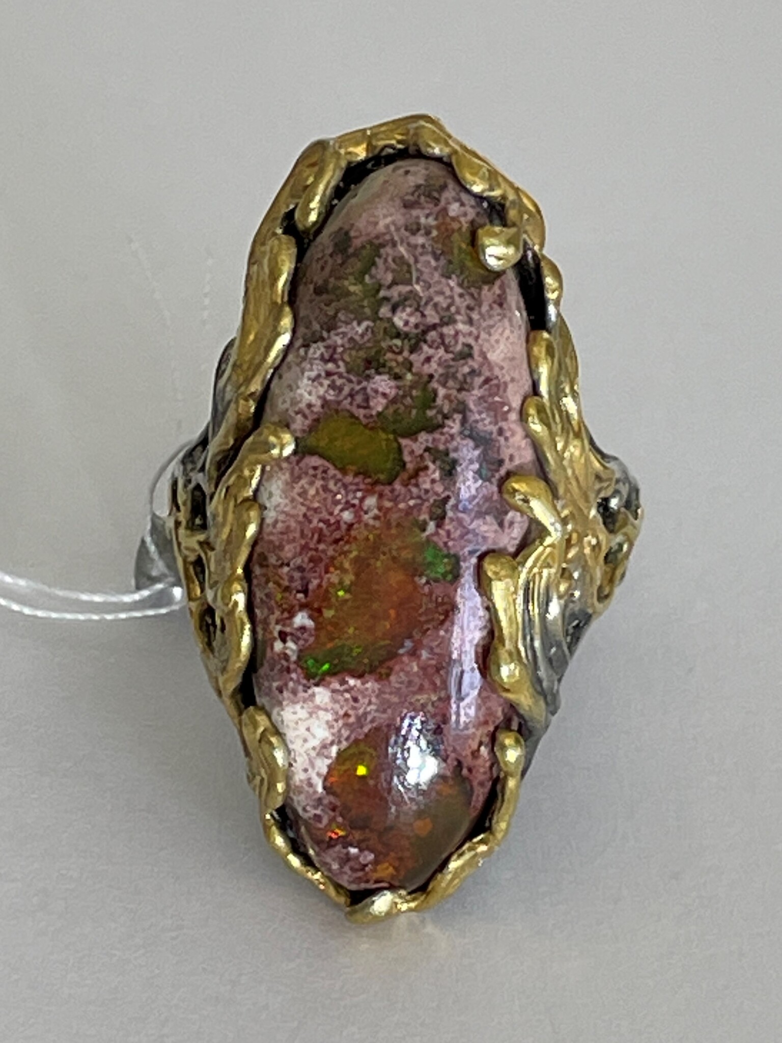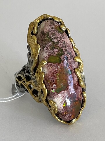 Фантазийное кольцо с натуральным опалом и витиеватым серебряным узором с позолотой.