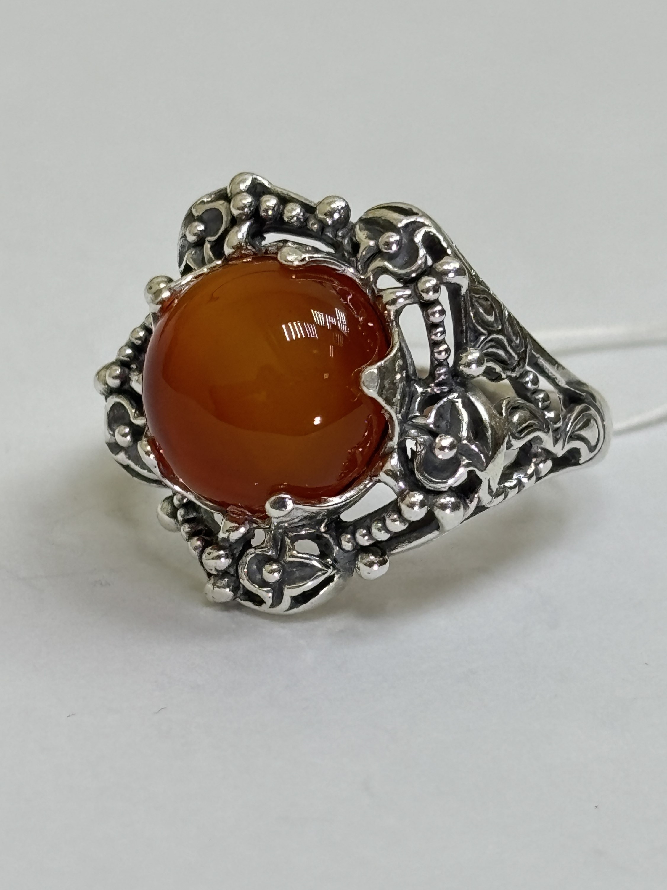 Эффектная серебряная оправа флористическим узором окружает натуральный камень в кольце.