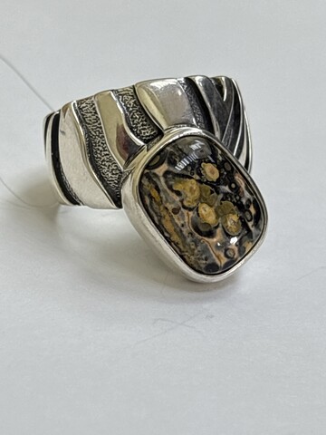 Широкое кольцо с текстурным серебром и завальцованным натуральным камнем.