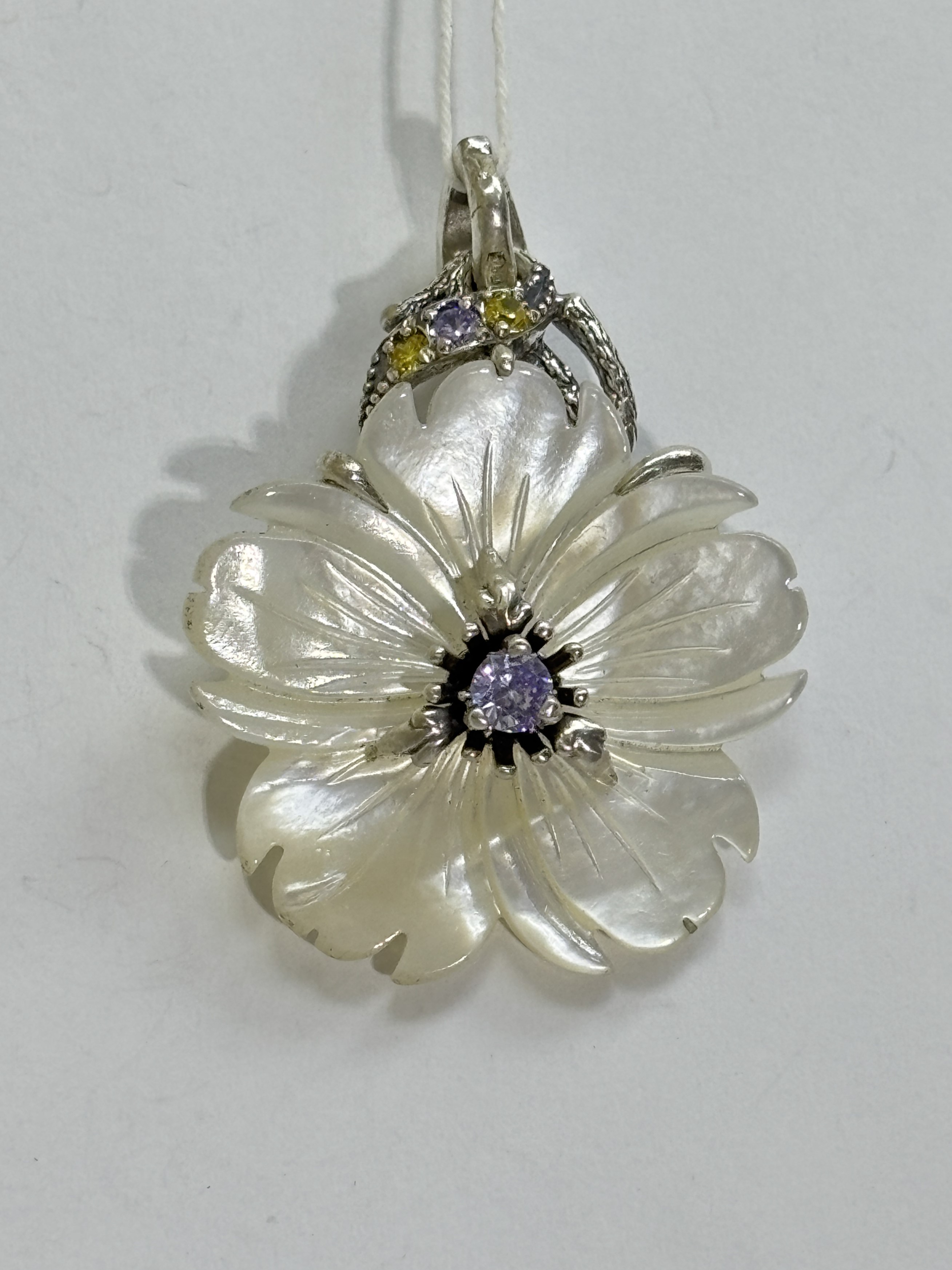 Резные соцветия из перламутра украшены серебряным орнаментом и фианитами.