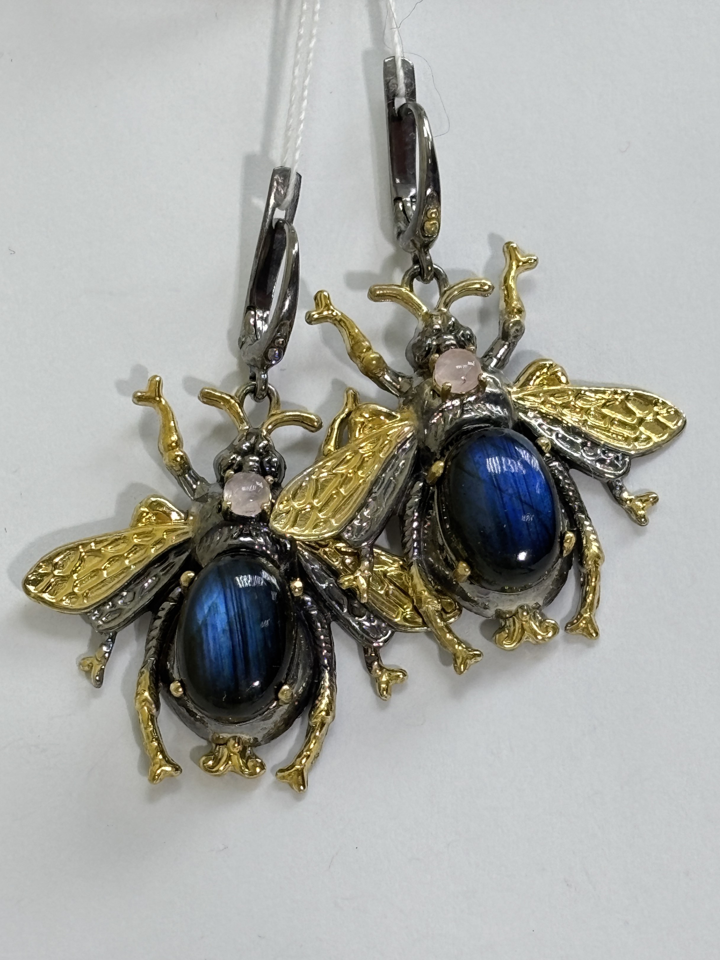 Серебряный майский жук с натуральным лабрадором в резном серебряном орнаменте с позолотой.