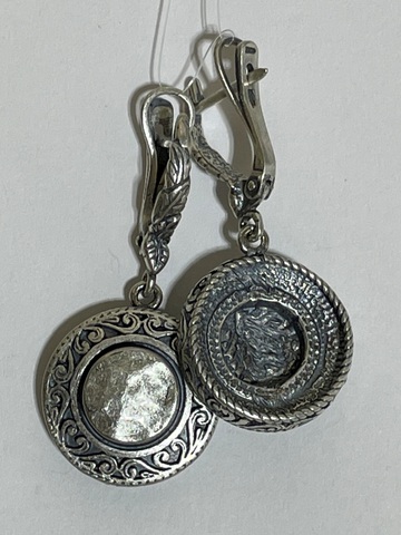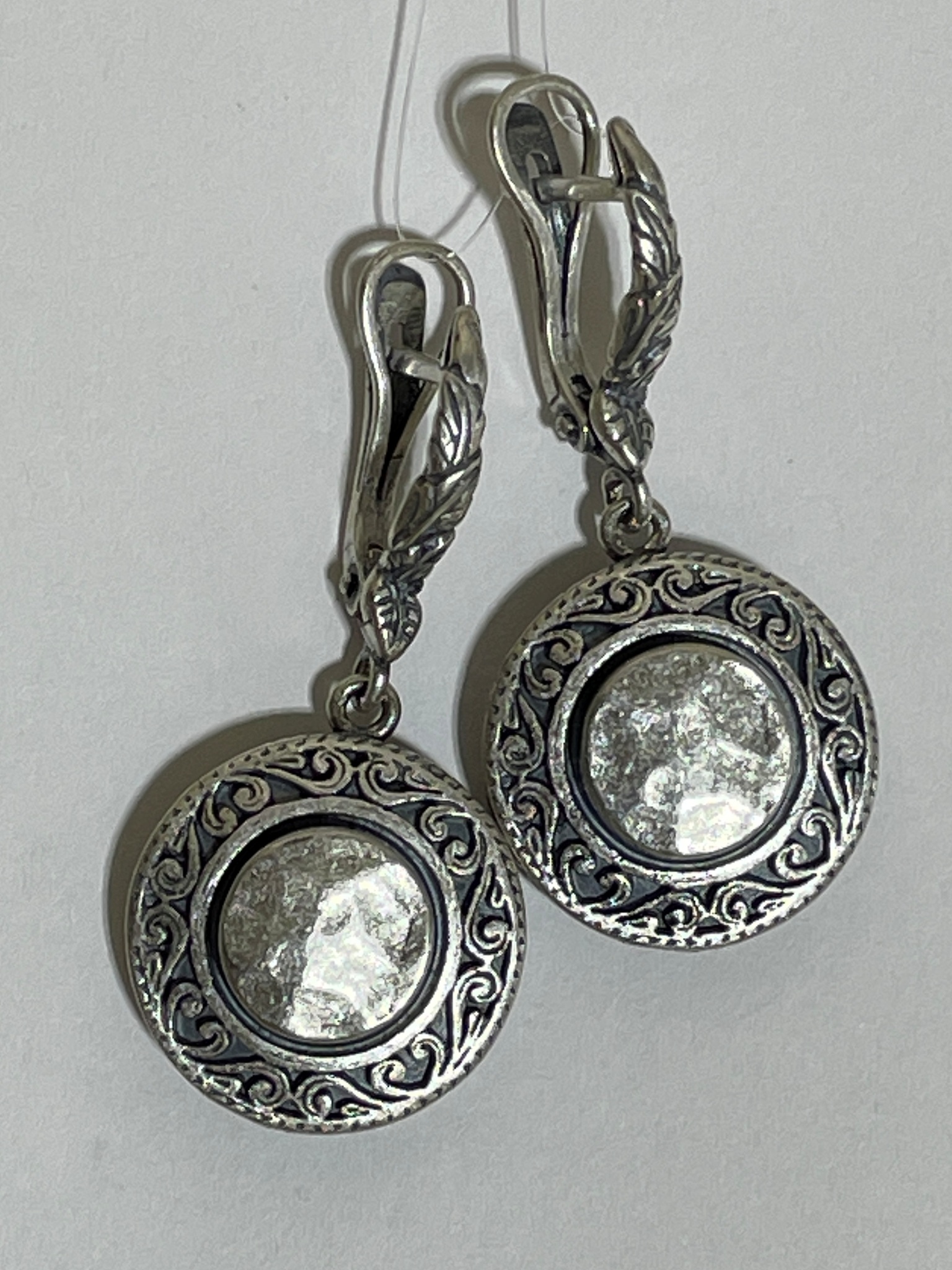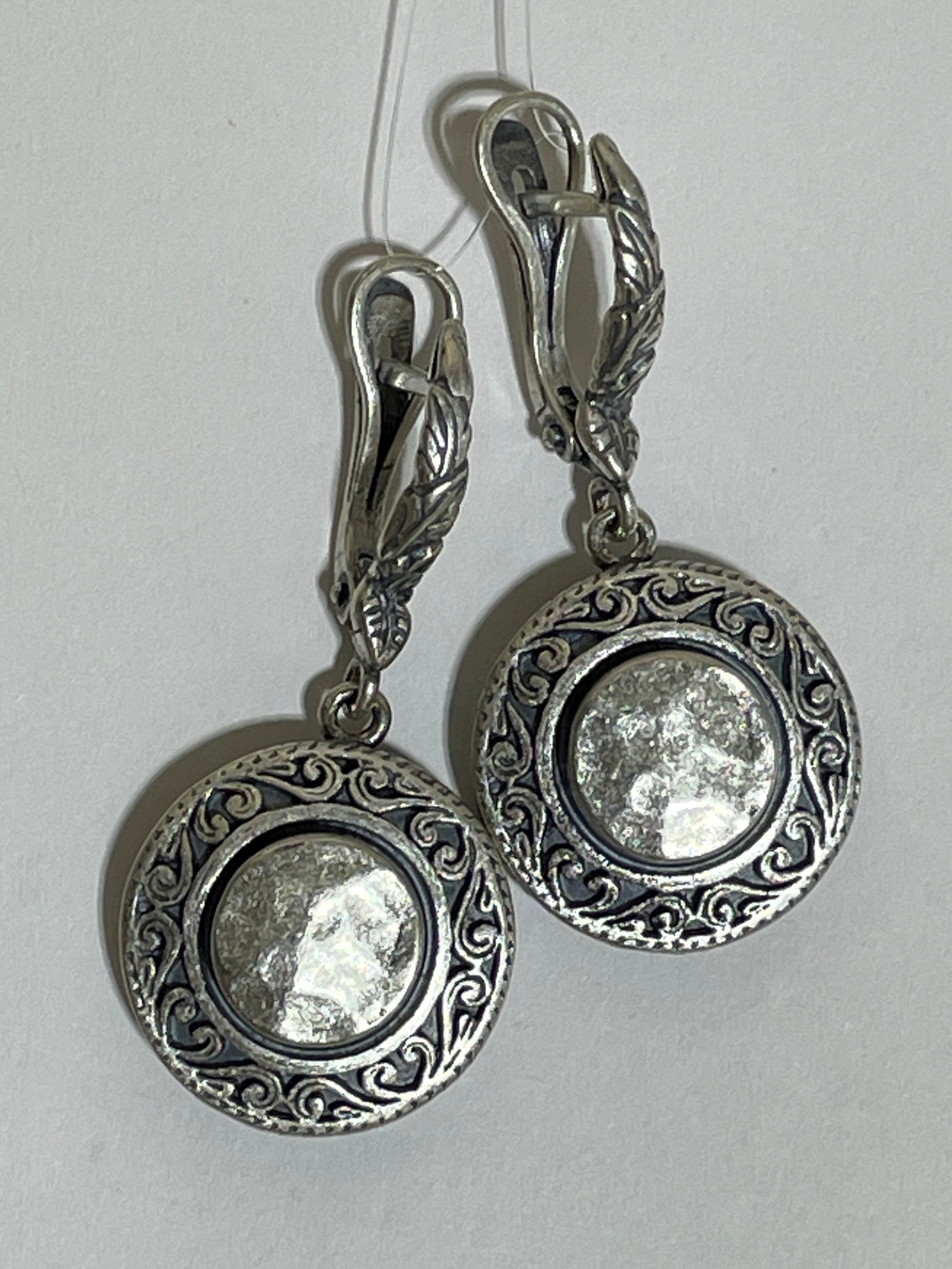Серебряные серьги с чернением и подвесным элементом в виде круга с орнаментом.