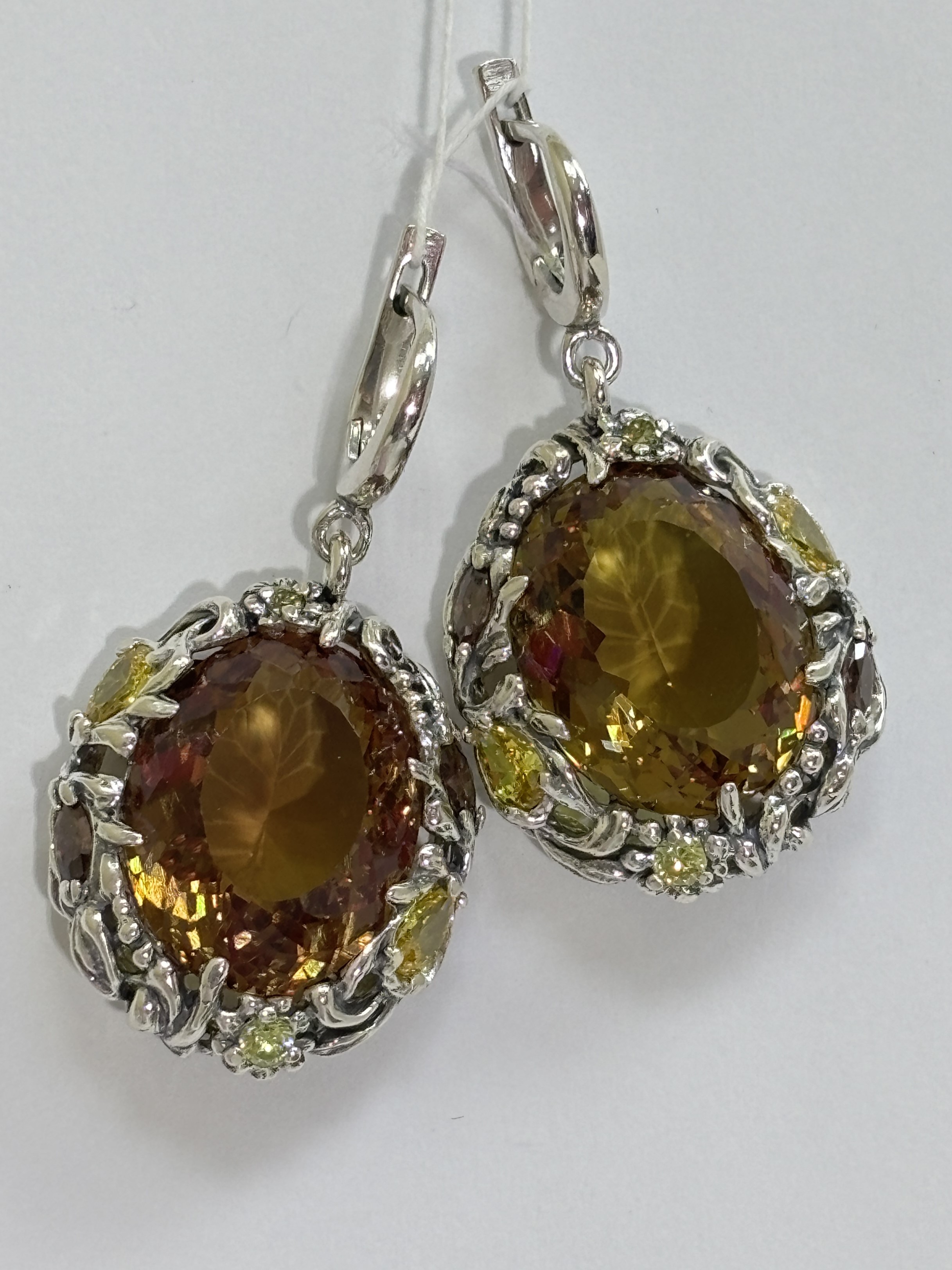 Нежный серебряный цветочный орнамент с фианитами окружил крупный султанит . Яркое активное украшение.