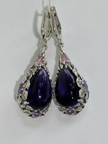Нежный серебряный цветочный орнамент с фианитами окружил крупный центральный камень . Длинные серьги.