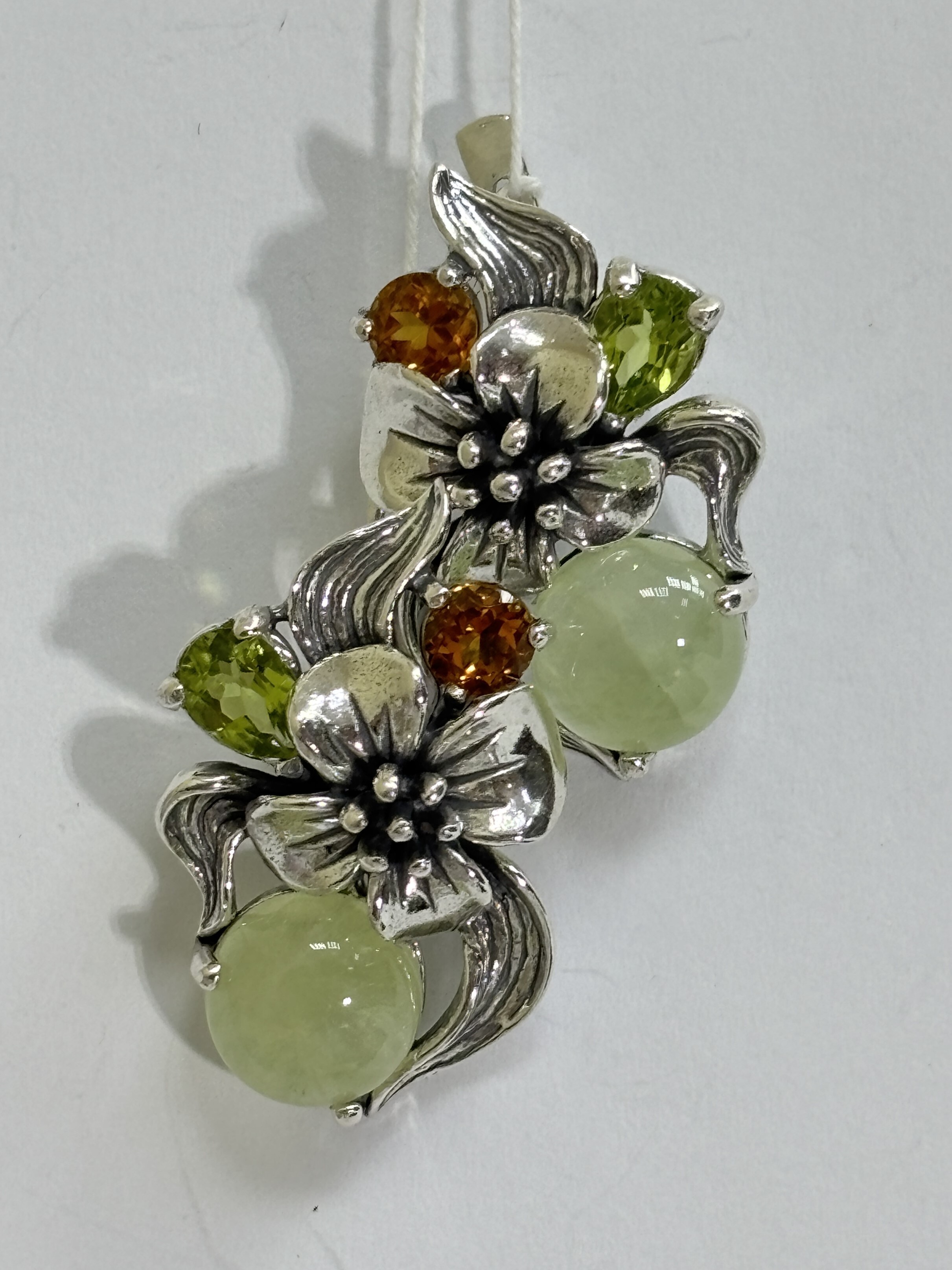 Фантазийно-сложеный узор из натуральных кабошонов, серебряных цветов и натуральных камней.