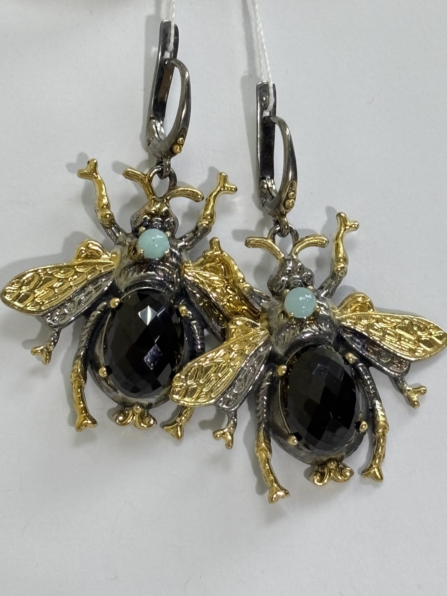 Серебряный майский жук с натуральным шпинелью в резном серебряном орнаменте с позолотой.
