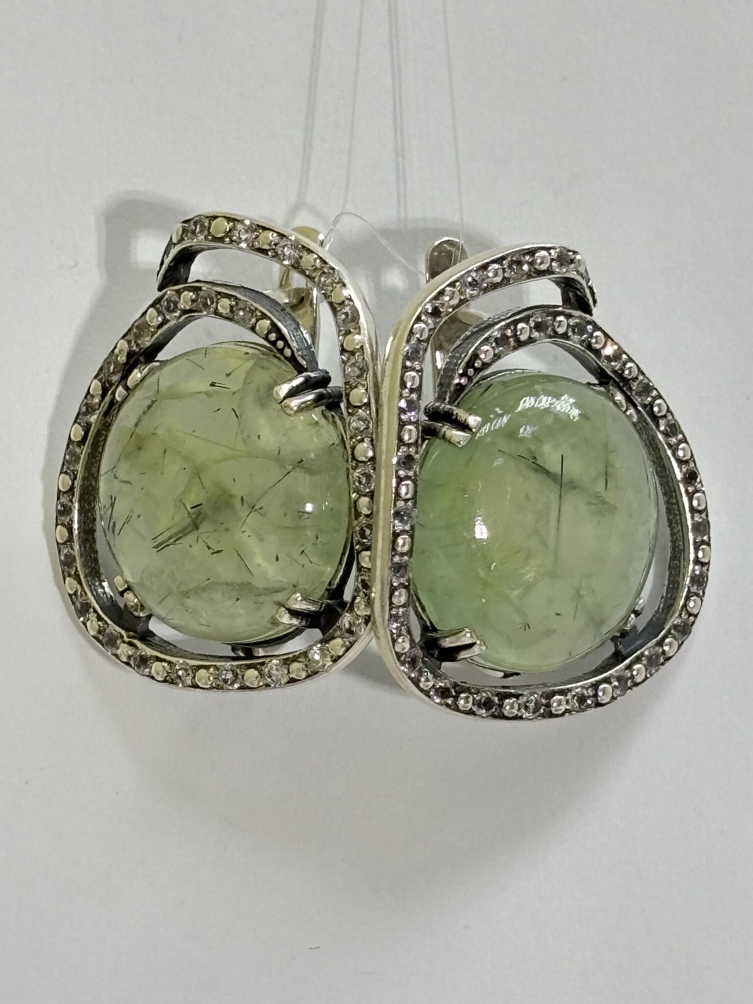 Круглый натуральный кабошон окружен ломаными завитками из серебра с цветными фианитами , действительно звезда.