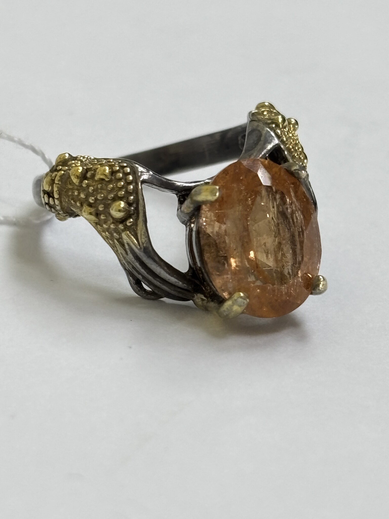 Фантазийное кольцо с натуральным топазом и украшенными женскими руками несущими камень.