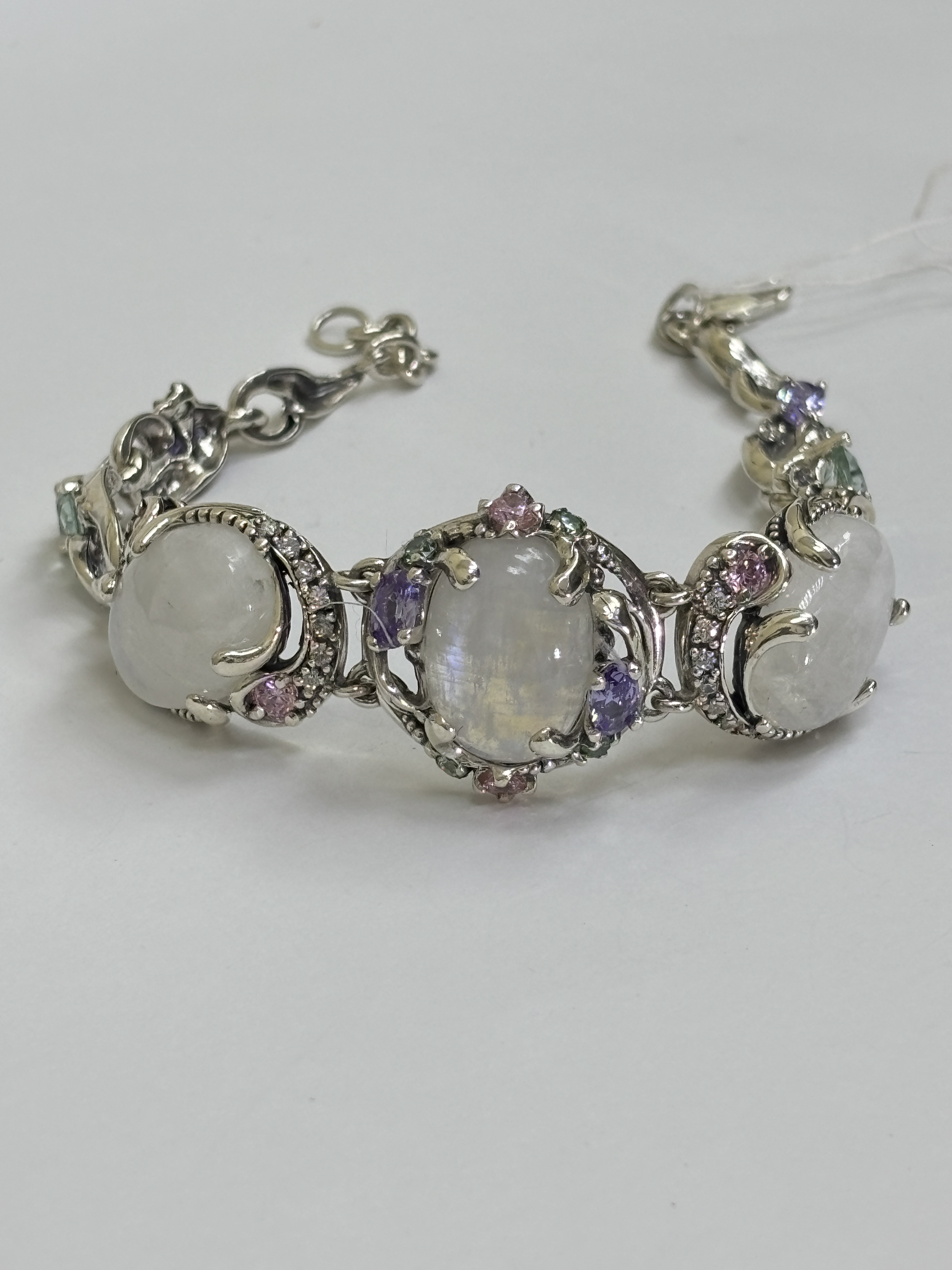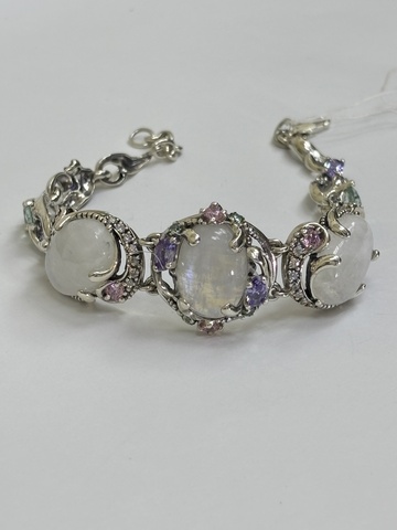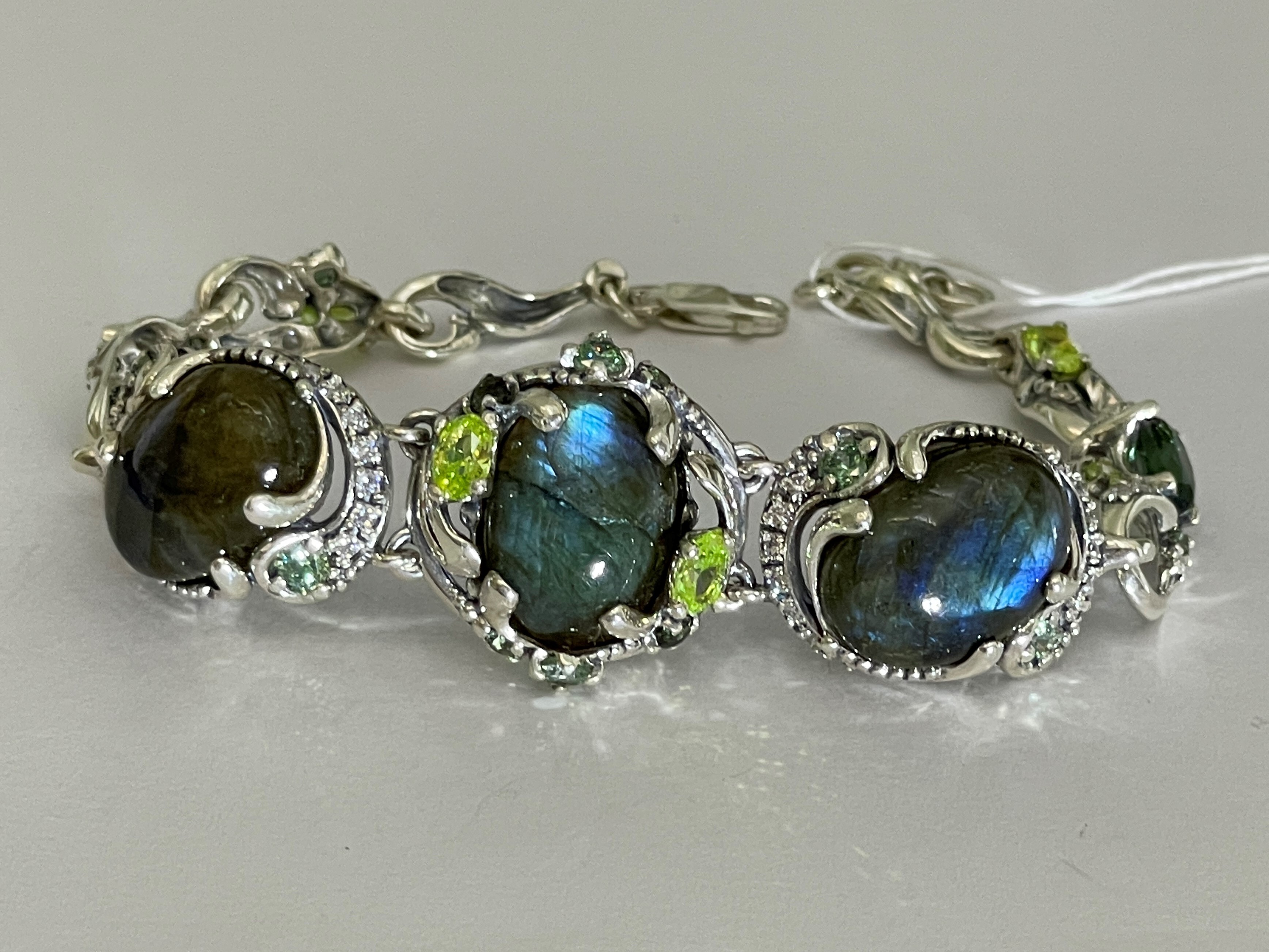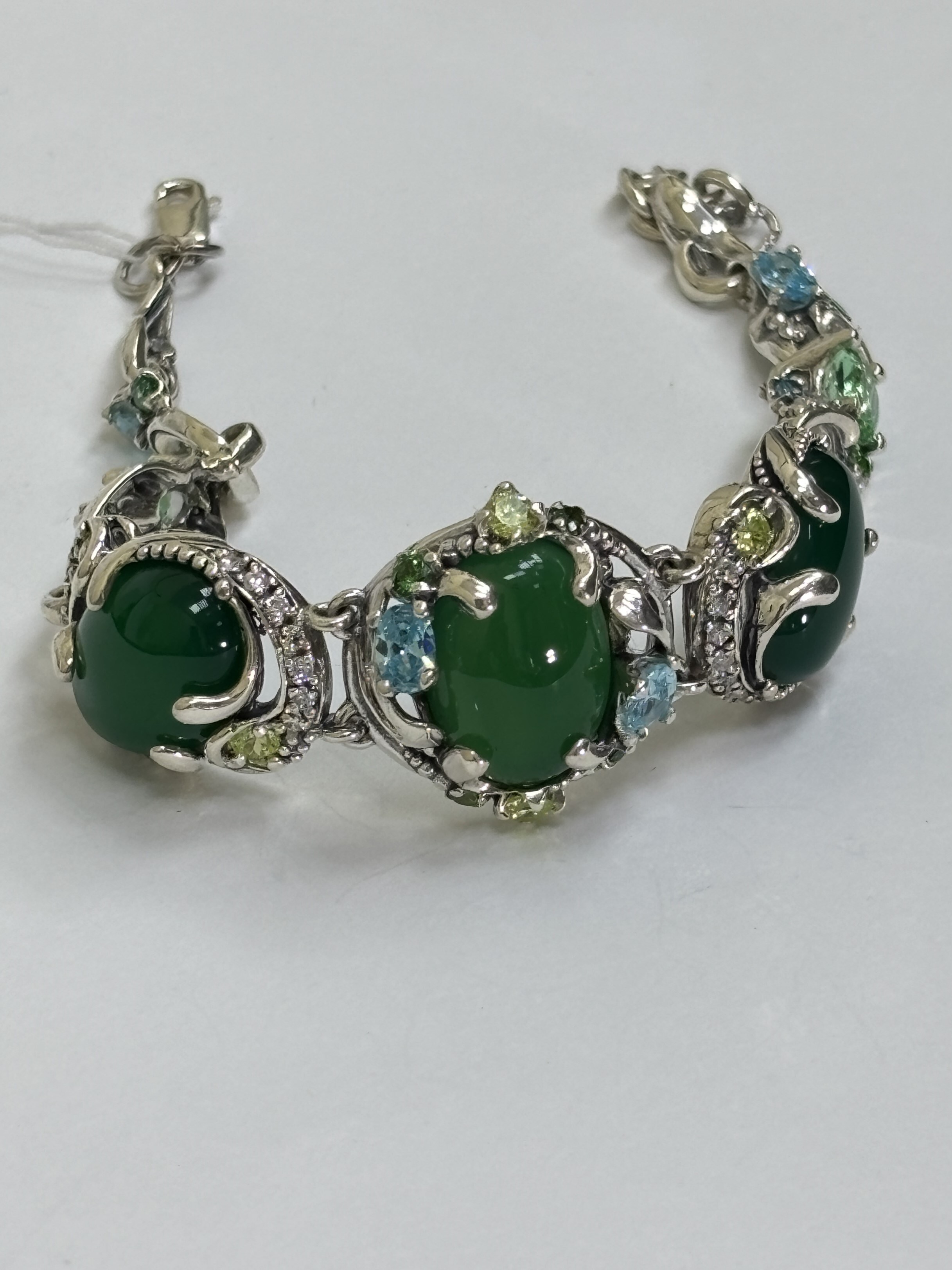 Сложная композиция из природных кабошонов ,серебряного орнамента и ограненных фианитов создают настроение роскоши.